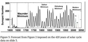 The National Science Foundation is caught (again) fudging data about solar cycles.  Fortunately honest data sources are still available to reveal the grand cycles that really control earth’s climate.  The reality does not predict a planet that is going to cook itself because of increasing carbon dioxide levels.  Despite the IPCC’s incessant propaganda pushing a climate crisis, what we actually have is a cognitive crisis for which evidence abounds everywhere.  The graph above is quite stark and simple to read-click to enlarge graph.  If the planet is heading into a climate crisis, it will not be one that cooks us, it will be one that freezes us. Read more.