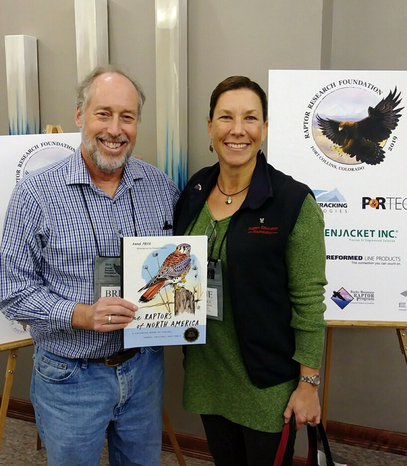 Brian Millsap, National Raptor Coordinator for the US Fish & Wildlife Service meets with Anne Price, REF Curator and Author at the 2019 Raptor Research Foundation conference in Fort Collins, Colorado. Brian will be reviewing the newest version of our book which sold out very quickly at Buteo Books whose display is a popular feature at many raptor conferences. |