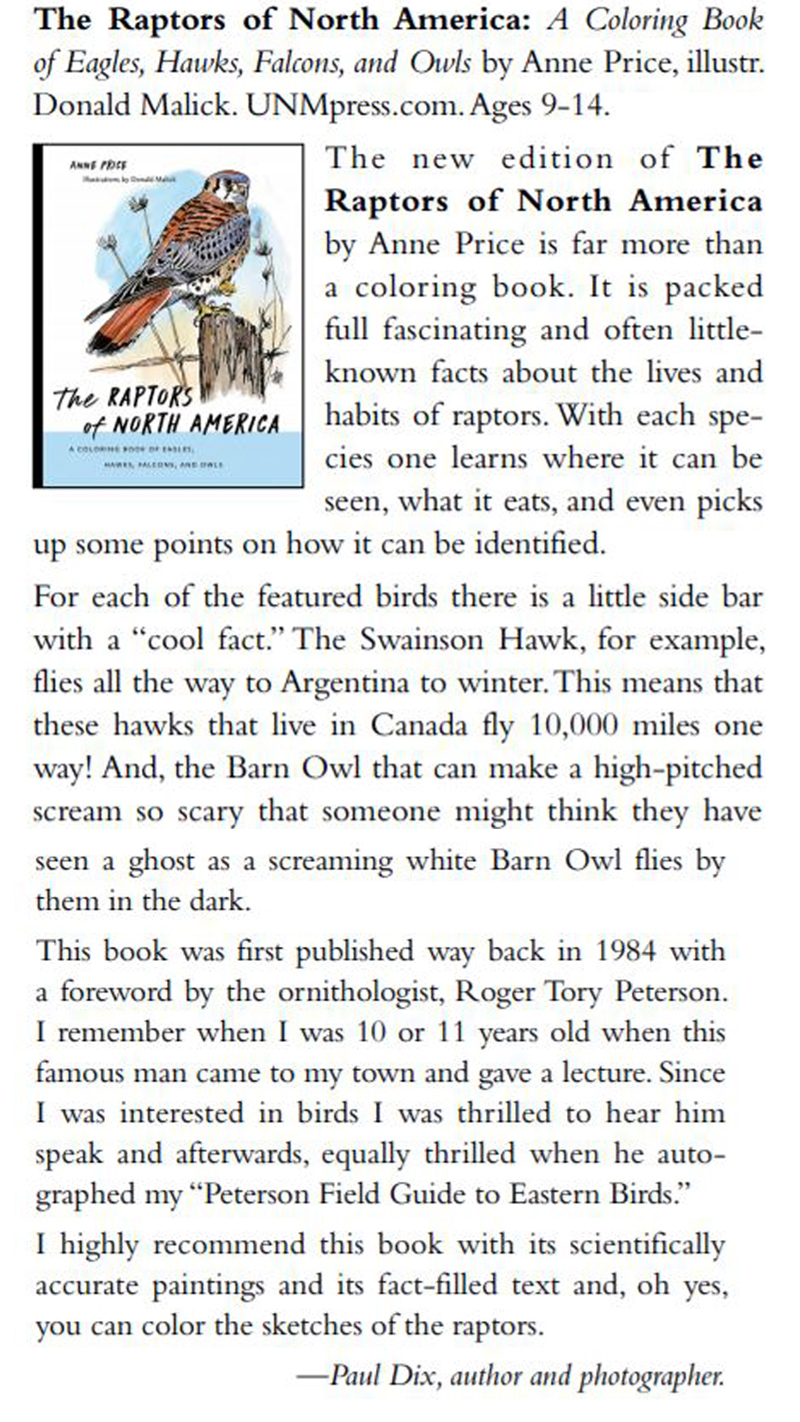 “A unique book aimed at introducing young and beginning birders to the world of raptors. . . . Creative for certain! Helpful, too.”–Jim Williams, Wingnut blog, Minneapolis Star Tribune