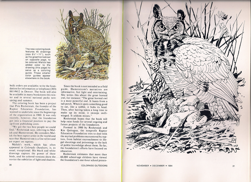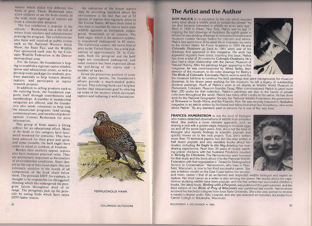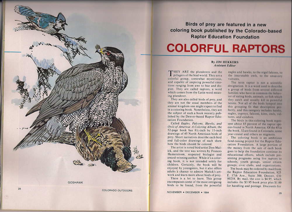 The original edition of our raptor book, written by Frances Hamerstrom, was released in 1984 and immediately found its way onto the cover of the smaller edition of Colorado Outdoors, published by Colorado Parks & Wildlife. Click on each page to enlarge the image to read the review. We will let Jim Hekkers’ words speak for themselves.