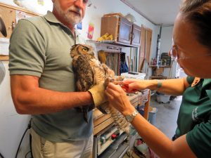 Meet our new male great-horned owl! He arrived around 11:30 AM August 5, from Michigan. He is one year old, having jumped early from his nest last year, and fracturing his right wing in the process. He was on the ground for about a week behind a barn before he was finally picked up and brought to rehab. A lot of people are curious about our intake process, which is what this brief video will show you. Because many rehab facilities do not always have time and/or resources for extensive husbandry, our basic intake procedure is to thoroughly inspect the bird, and prepare the bird for captive training. In his case his beak had some damage and needed to be coped (trimmed and shaped) as did his talons. Since he is coming in to be part of our educational collection, bracelets have to be fitted around the tarsi and attached so that jesses (straps) can be inserted to give us control of his powerful feet. Because of his heavy weight (60 oz) and his big feet, we will be testing the bird’s DNA to determine his sex for certain. During our inspection we discovered some issues with his right eye that must be evaluated for long-term consequences, and we will also be getting him radiographed so that we have a complete understanding of his original injuries, and how those might affect his training procedures and housing requirements. He goes into quarantine and behavioral observations at our Curator’s home for about ten days, before he is introduced to his new quarters and roommate (our barred owl). Take some moments to see our new video posted on our Facebook page to see more of this Michigan beauty. Thanks to Savannah Grout for pictures and video.