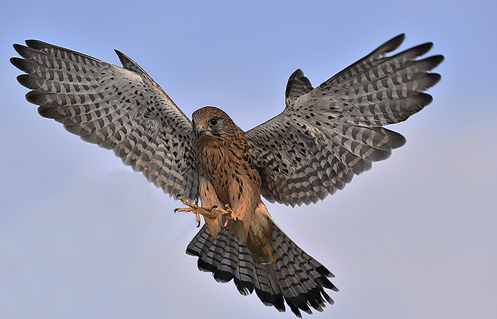 | Eurasian/Common Kestrel: Falco tinnunculus DOB: 2013 Sex: F Weight: 8.5 oz Wingspan: 28 in Our Eurasian or “Common” kestrel, is anything but common. She is the only raptor we care for which is not native to North America. Though similar in appearance to the American kestrel, she is twice as large. Originally bred in captivity here in the US for falconry, she was donated to us in 2017 by a falconer who was moving to a very cold climate and didn’t believe the environment would be suitable for flying. |