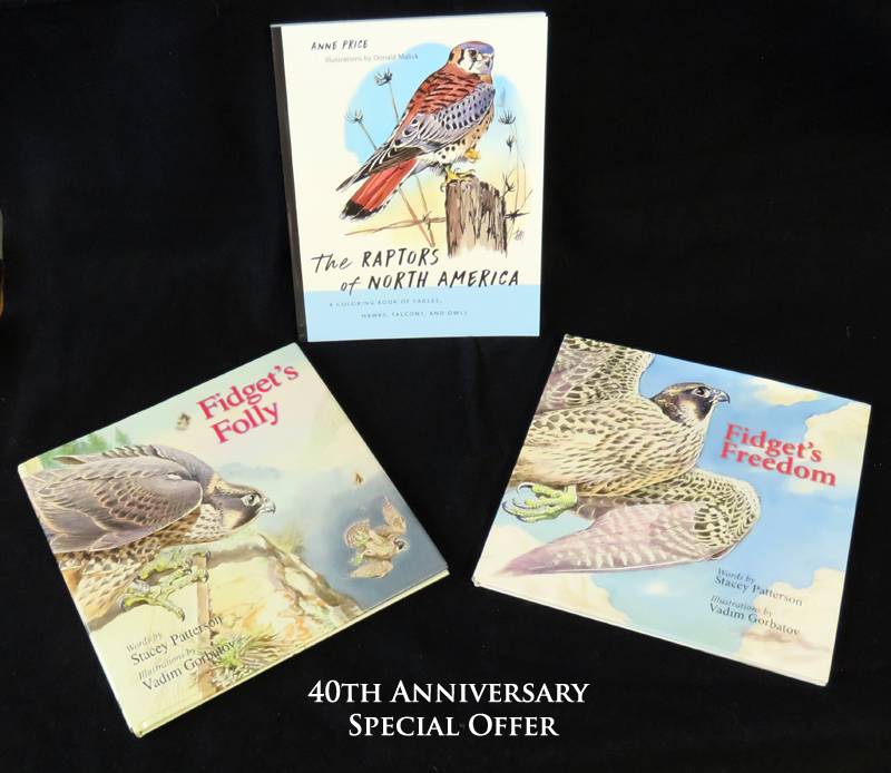 Enjoy the start of our 41st anniversary by giving yourself all three of our beautiful books! Featuring the best raptor illustrations you will find anywhere, you can own all three for the exclusive price of $32.95. Just in time for the holiday season! The Raptors of North America has all of North America’s raptors with text by REF’ s Curator, Anne Price, illustrated by one of the best American wildlife artists ever to come out of the 20th Century, Donald L. Malick. The Fidget set was created by Stacey Patterson, telling the delightful and scientifically accurate story of a young peregrine falcon. They are illustrated by one of the world’s best living wildlife artists, Russia’s Vadim Gorbatov.
