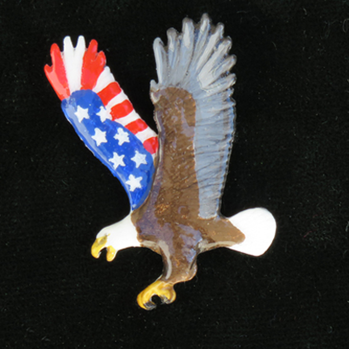 Beautifully created from fine pewter this bald eagle pin is then hand painted with our exclusive motif. A limited supply of these pins is available and after we run out we will not duplicate them. Shipping charges are included in the price. Discounts for two or more. The pin measures 1 1/2″ x 1 1/8″ and has two clasps to hold it tight.