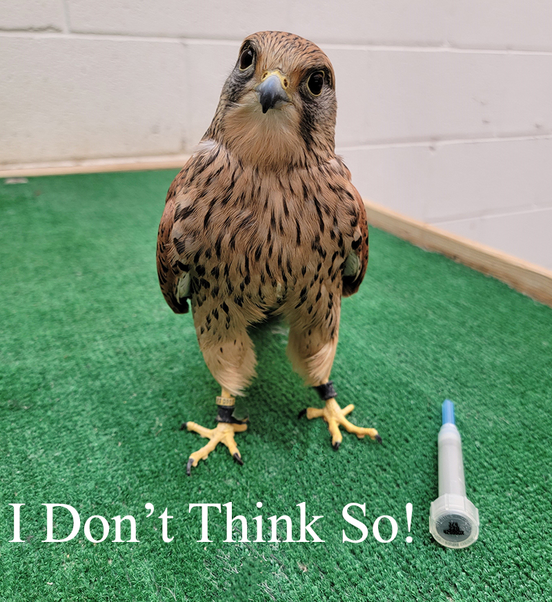 Our female Eurasian kestrel doesn’t seem very happy at the prospect of receiving an injection, but part of the annual health management for all of our raptors requires vaccination against the perpetual threat of West Nile virus. The mosquito season is fast approaching, and the only vaccinations available for birds, 25 years after the virus’ first appearance in the US, are those meant for horses. Ongoing studies and trials confirm that vaccinating does confer some immunity to raptors, however, the level of protection varies widely among species and ages of birds.
